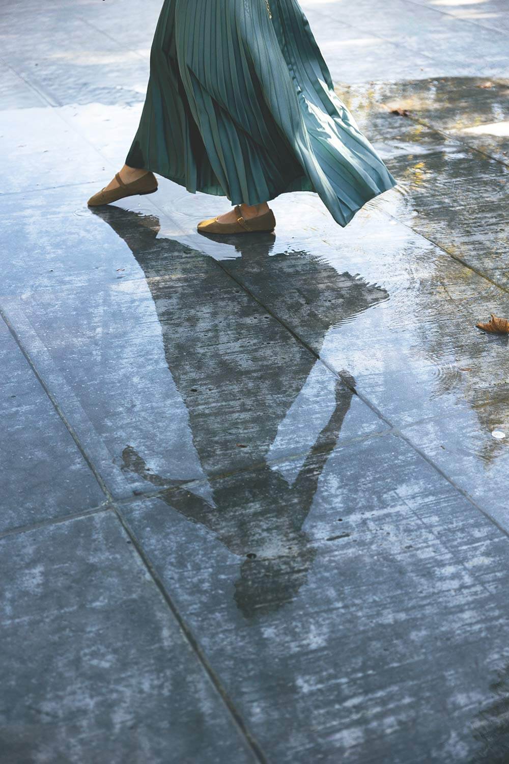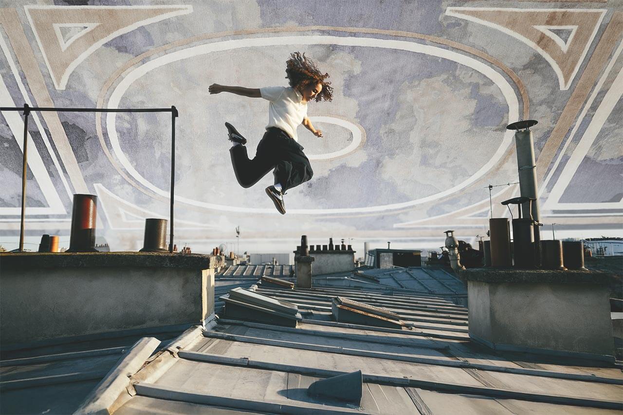 The idea of “the sky at our feet” also became the conceptual foundation for the photo shoot of the collection in Paris. Now, one can gaze at the sky reflected in architectural surfaces — seeing it upside down, through the prism of movement. This vision was brought to life with the help of parkour athlete Lola Roy.
